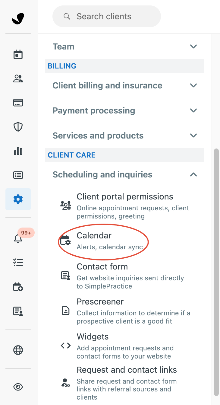 Under Settings, locate Client Care, then click the Scheduling and Inquiries dropdown to access Calendar.